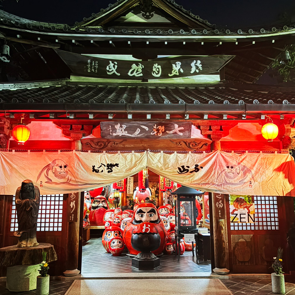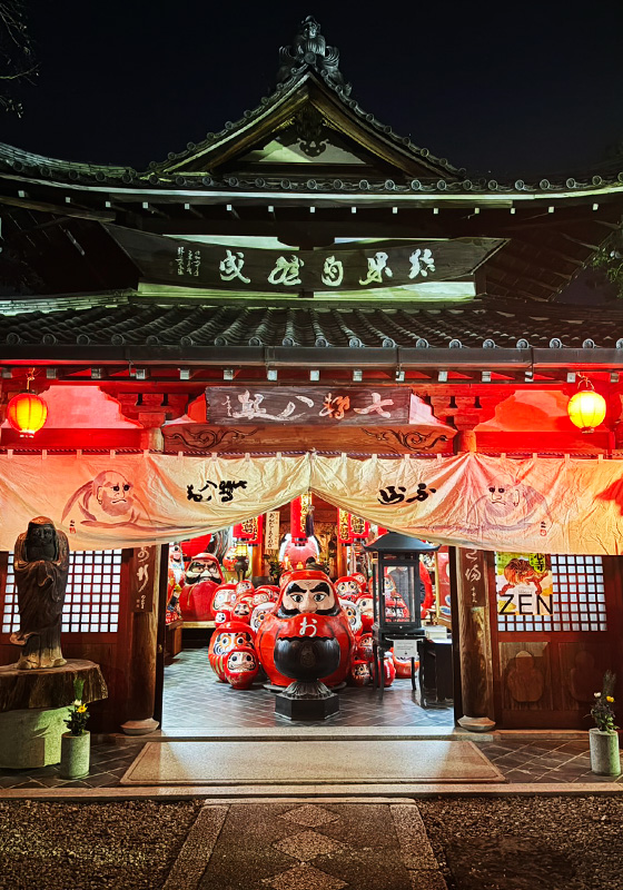 本堂にずらりと並ぶだるまさん。夜はお庭がライトアップされ昼間とはまた違った雰囲気を楽しんでいただけます。